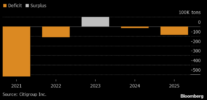 Прогноз Citigroup по балансу рынка меди: оранжевым обозначен дефицит, серым - избыток (в сотнях тысяч тонн в год). Источник: Citigroup, Bloomberg