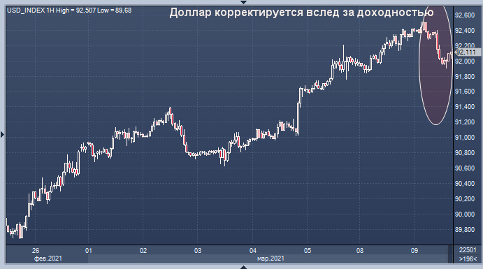 Индекс, который измеряет силу доллара по отношению к корзине других валют, к полудню в Лондоне снизился на 0,4% до 92,003 после достижения максимума за 3,5 месяца в 92,506 в часы азиатских торгов.