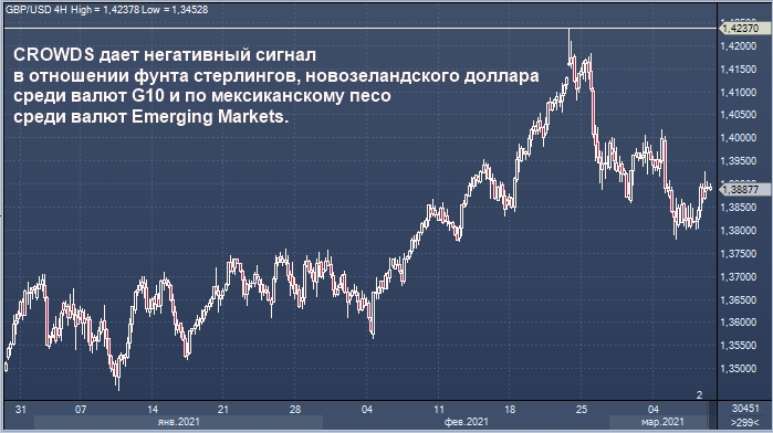 В настоящий момент модель CROWDS дает позитивный сигнал относительно перспектив франка и иены среди основных валют, а также российского рубля — среди валют развивающихся рынков. CROWDS дает негативный сигнал в отношении фунта стерлингов, новозеландского доллара среди валют G10 и по мексиканскому песо среди валют Emerging Markets.
