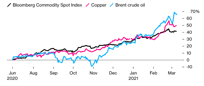 С начала ноября нефть подорожала на 75%, поскольку крупнейшие экономики вакцинируют население и возобновляют работу после закрытия заводов и простоя самолетов из-за пандемии. Медь, используемая при производстве различных товаров, от автомобилей до стиральных машин и ветряных турбин, торгуется на уровнях, которые в последний раз наблюдались десять лет назад. Цены на продукты питания растут каждый месяц с мая.