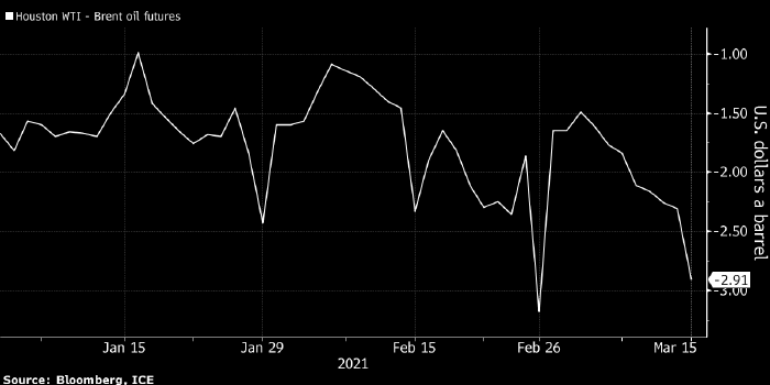 Спред между фьючерсами на нефть WTI в Хьюстоне и фьючерсами на Brent. Источник: ICE, Bloomberg