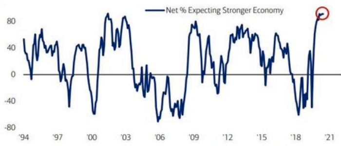 В целом настроения участников рынка остаются однозначно бычьими, и рекордные 91% участников опроса ждут дальнейшего восстановления мировой экономики (см. график ниже - прим. ProFinance.ru). Это - «наиболее оптимистичный экономический прогноз за всю историю», отмечает Bank of America.