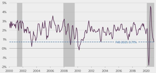 На самом деле инфляция в США замедляется, а не ускоряется, отмечают эксперты со ссылкой на данные за февраль, которые показали замедление базовой трехмесячной реализованной инфляции с 1,0% до 0,7%, что является одним из наиболее низких значений за последние десятилетия (см. график ниже — прим. ProFinance.ru).