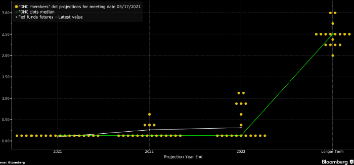 В этот раз большее, чем на январском заседании, число членов FOMC указали 2023 год в качестве ожидаемого времени первого повышения ставок, однако медианный прогноз Комитета все же не подразумевает повышения ставок до конца 2023 года.