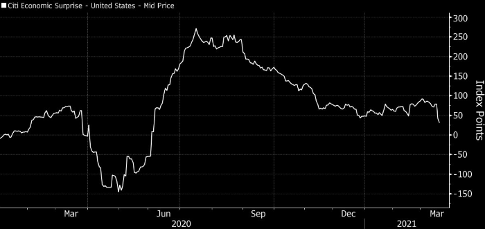 Последние данные по экономике США оказались хуже прогнозов. Несмотря на это, кривая доходности — разрыв между доходностью 10-летних и двухлетних казначейских облигаций — превысила 150 базисных пунктов впервые с 2015 года. Как правило, более крутая кривая подразумевает ожидаемую рефляцию в будущем, что потребует повышения ставок. Так что это явно говорит об экономическом оптимизме.
