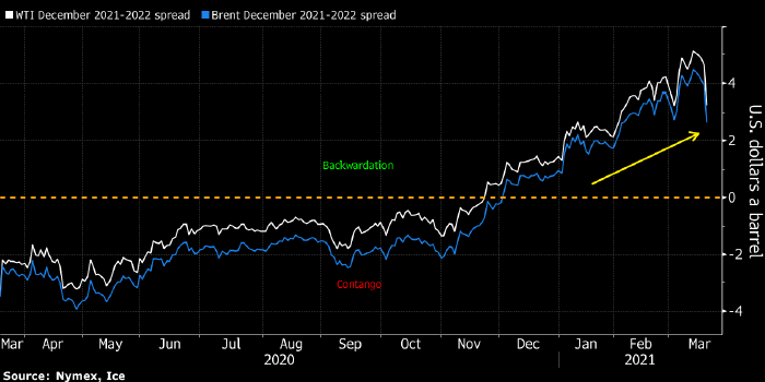 Внутридневное снижение цен на нефть достигало в четверг почти 10%, однако форма фьючерсной кривой продолжает говорить о силе рынка. Долгосрочная бэквордация* в нефти Brent и WTI (декабрь 2021 года минус декабрь 2022 года — прим. ProFinance.ru) сохраняется, что указывает на рост спроса и снижение предложения, а также говорит о силе рынка.