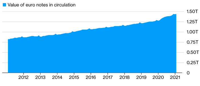 По состоянию на конец 2020 года в обращении находились банкноты на сумму более 1,4 трлн евро. Это на 11% выше, чем в прошлом году. Тем не менее данные свидетельствуют о том, что только пятая часть этого объема используется для транзакций в еврозоне.