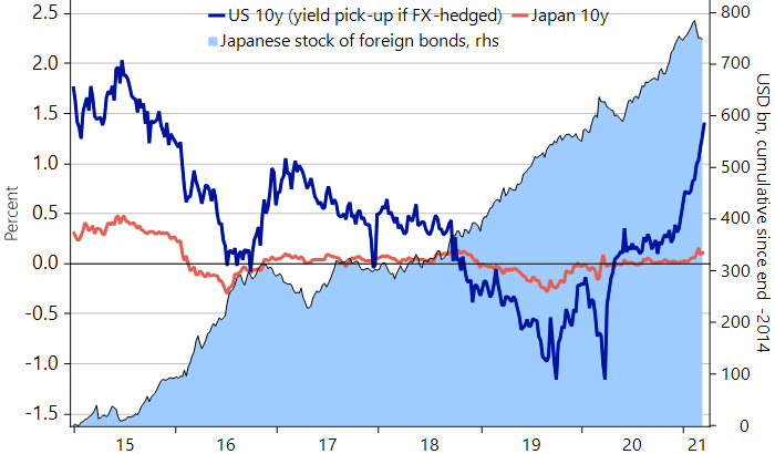 Доходность 10-летних трежерис с учетом стоимости трехмесячного хеджирования (синим, левая ценовая шкала), доходность японских десятилеток (красным), а также объем принадлежащих Японии иностранных облигаций (голубая заливка, в млрд долларов, правая шкала). Источник: Nordea