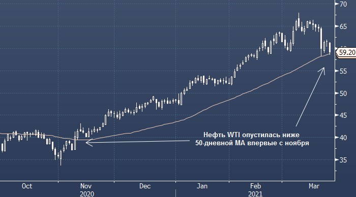 В прошлый понедельник спред между ближайшими фьючерсами на WTI (апрель минус май — прим. ProFinance.ru) достиг наиболее глубокого контанго с января. А сегодня ближайший контракт на WTI (май) впервые с ноября опустился ниже 50-дневной скользящей средней, что также говорит о слабости рынка.