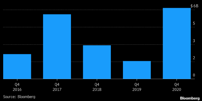 По мере восстановления цен на нефть после коллапса в феврале-апреле 2020 года рынок поверил в воскрешение сланцевой отрасли США, и американские независимые нефтегазовые компании разместили в четвертом квартале мусорные облигации на $6,1 млрд, что стало рекордным значением за последние десять лет.
