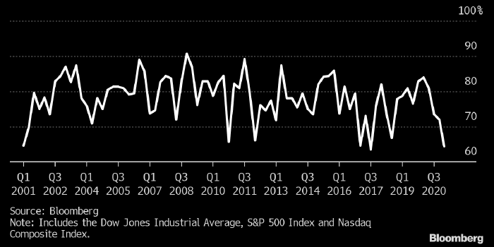 В этом году три основных фондовых индекса США (S&P 500, Down Jones Industrial и Nasdaq Composite) показывают вторую наихудшую корреляцию с 2001 года: она составляет всего 64% против среднего исторического квартального значения на уровне 78%. Это происходит на фоне ухода инвесторов из акций технологических компаний, которые показывали опережающую динамику во время пандемии, в бумаги компаний, которые станут главными бенефициарами ее окончания.