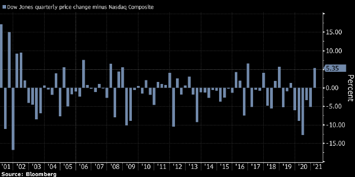 Квартальное процентное изменение Dow Jones Industrial против Nasdaq Composite. Источник: Bloomberg