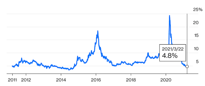Подобному росту способствуют гораздо более благоприятные условия кредитования, которое для сланцевой нефти является незаменимым топливом, как и сама нефть для экономики. Спреды по мусорным облигациям энергетического сектора, скорректированные на опционы, — величина премии по сравнению с основными расходами по займам, которые небольшие нефтедобывающие компании должны платить для финансирования деятельности, — упали во вторник до 4.6% по сравнению с 22.4% год назад.