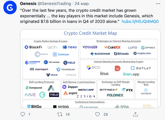 Некоторые из крупнейших небанковских организаций в криптовалютной отрасли, включая BitGo, BlockFi, Galaxy Digital и Genesis, расширяют услуги, чтобы удовлетворить спрос инвесторов на доллары, так как банки не хотят кредитовать частных лиц или компании, связанные с биткоином и другими цифровыми активами. Они кредитуют хедж-фонды, которым нужны наличные деньги, чтобы купить биткоин для сделки, которая почти гарантированно окупится. Годовая доходность криптовалютного актива колеблется в диапазоне 20-40%.