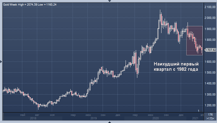 В первом квартале золото подешевело примерно на 10%, что стало рекордным падением для этого периода с 1982 года, пишет Bloomberg. Снижение цены золота, которое не приносит никакого процентного дохода, было обусловлено ростом доходности облигаций и курса доллара.