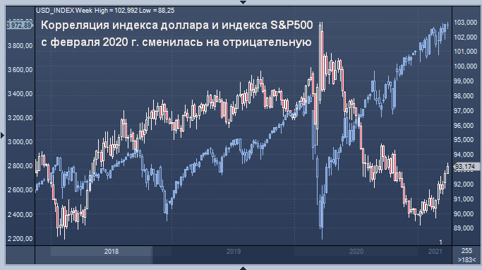 График индекса доллара (белый) и индекса S&P500 интервалами в 1 неделю