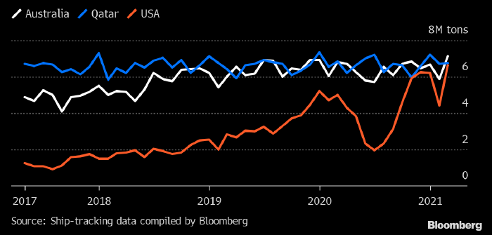 Экспорт СПГ из Австралии, Катара и США в млн тонн. Источник: Bloomberg