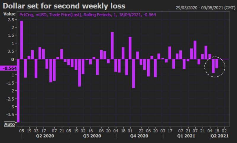Доллар близок к тому, чтобы продемонстрировать падение вторую неделю потерь. В пятницу валюта остается слабой на фоне продолжительного снижения доходности казначейских облигаций. Инвесторы все больше убеждаются настойчивыми доводами Федеральной резервной системы о временном всплеске инфляции.