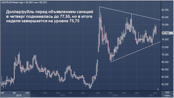 Рубль вечером в пятницу, 16 апреля, укреплялся с начала недели на 2,17% к доллару США. Среди 24 валют развивающихся рынков только южноафриканский ранд мог похвастаться сопоставимой динамикой. Однако именно рубль был лидером среди валют Emerging Markets. Неделя оказалась лучшей с ноября 2020 года. Валютная пара доллар/рубль перед объявлением санкций в четверг поднималась до 77,55, но в итоге неделя завершается на уровне 75,75.