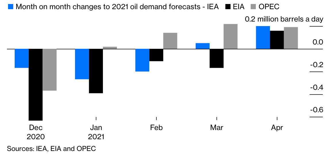 В последних ежемесячных отчетах Международное энергетическое агентство, Управление энергетической информации США и Организация стран-экспортеров нефти повысили прогнозы по спросу на нефть в 2021 году. Впервые с начала публикации таких прогнозов все они были более оптимистичны, чем месяцем ранее.