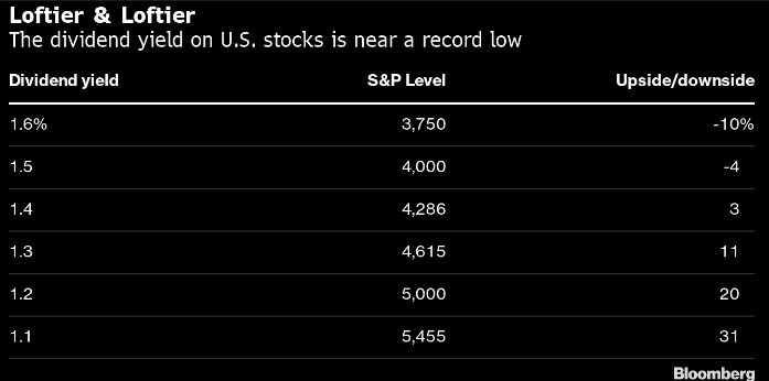 Прогнозируемая дивидендная доходность индекса достигла 1,44% в понедельник, что всего на один базисный пункт выше самого низкого уровня, который когда-либо наблюдался в данных, собранных Bloomberg начиная с 2006 год. Это может частично объяснить покупки, которые мы наблюдали в 10-летних казначейских облигациях в этом месяце, что снизило их доходность с момента достижения пика 1,77%.