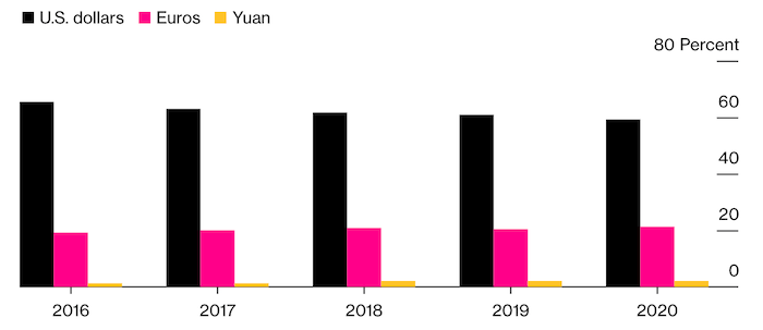 Китайские политики также неоднократно подчеркивали, что цифровой юань не предназначен для того, чтобы конкурировать с долларом. Заместитель управляющего Народного банка Китая Ли Бо заявил в прошлые выходные, что криптовалюта в первую очередь предназначена для внутреннего использования. Китайская валюта в настоящее время составляет около 20% мировых валютных резервов. На долю доллара приходится 60%, кроме того, почти все торговые и кредитные операции в рамках инициативы «Один пояс, один путь», осуществляются в долларах.
