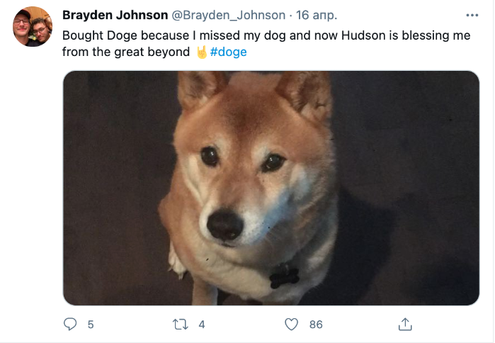 26-летний Брейден Джонсон, электрик из Альберты, Канада, купил Dogecoin в память о своем Сиба-ину по имени Хадсон, который скончался в прошлом году в возрасте 15 лет.