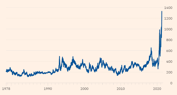 Фьючерсы на пиломатериалы взлетели более чем на 50% в этом году, превысив $1327 за 1000 досковых футов (это $562 за кубический метр), поскольку компании по строительству домов и строительные магазины вынуждены бороться за сокращающиеся поставки. Это привело к росту прибыли с момента кризиса Covid-19 до 400%, что значительно выше предыдущего максимума контракта в $650, установленного в 2018 году.