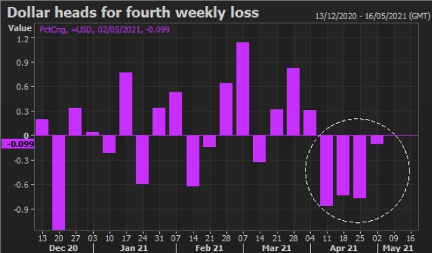 График, показывающий, как доллар может понести убыток четвертую неделю. Данные Reuters