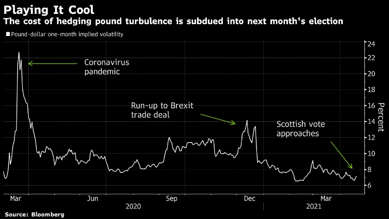 Несмотря на то, что перспектива активного шотландского откола пугает трейдеров, рынки деривативов остаются спокойными. Опционы показывают, что стоимость страхования колебаний фунта намного ниже недавних пиков. Пятилетние изменения риска в торговле фунтом близки к среднему значению с тех пор, как Bloomberg начал собирать данные в 2005 году.