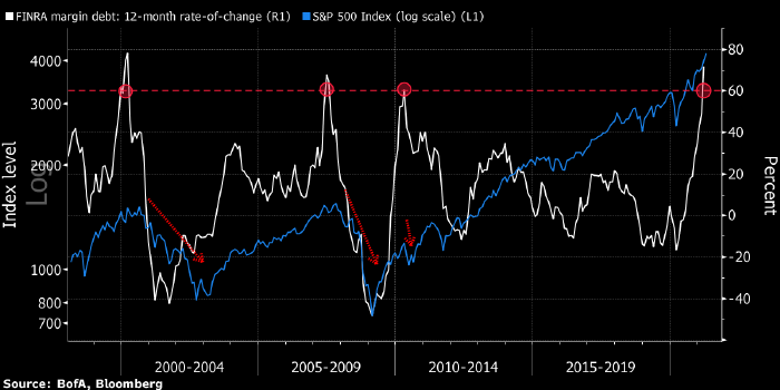 Годовое процентное изменение маржинального долга на рынке акций США (белым, правая ценовая шкала) и динамика индекса S&P 500 (голубым, левая шкала). Источник: FINRA, Bank of America, Bloomberg