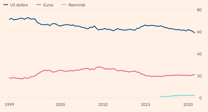 Доллар также является основным средством накопления в мире: на его долю приходится почти 60% резервов официального сектора. Доля его ближайшего конкурента евро составляет 21%, а юаня — чуть более 2%.
