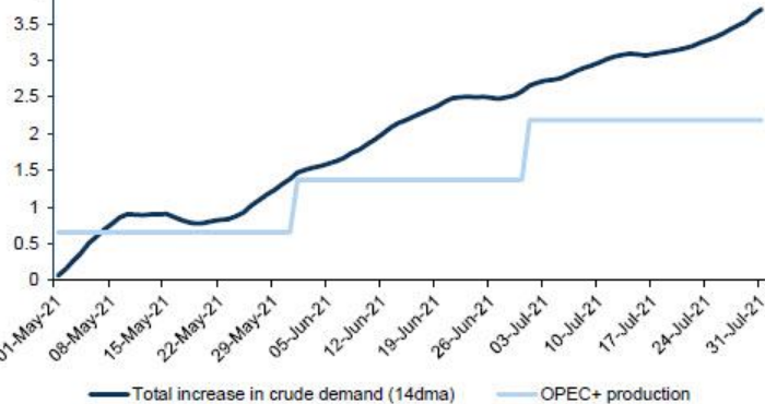 Совокупный рост мирового спроса на нефть (темная линия) и рост добычи ОПЕК+ (светлая линия) в млн б/д. Источник: Goldman Sachs