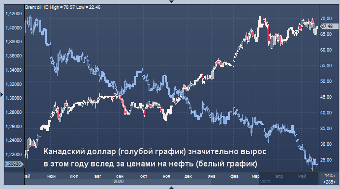 График канадского доллара к доллару США и график нефти Brent интервалами в 1 день