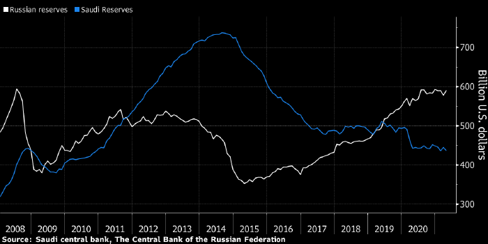 Динамика международных резервов двух ведущих игроков ОПЕК+, России и Саудовской Аравии, расходятся все сильнее, хотя обе страны являются бенефициарами роста цен на нефть.