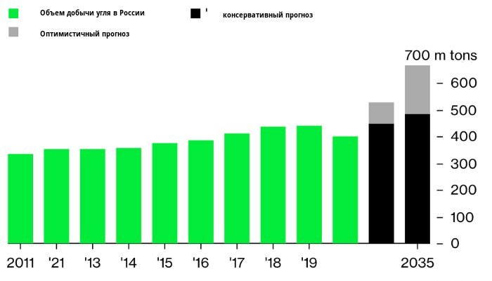 Угольная стратегия, утвержденная правительством России в прошлом году, предусматривает увеличение добычи угля в 2035 году на 10% по сравнению с докоронавирусным уровнем, согласно самому консервативному сценарию, основанному на росте спроса не только со стороны Китая, но и Индии, Японии, Кореи, Вьетнама и, возможно, Индонезии.