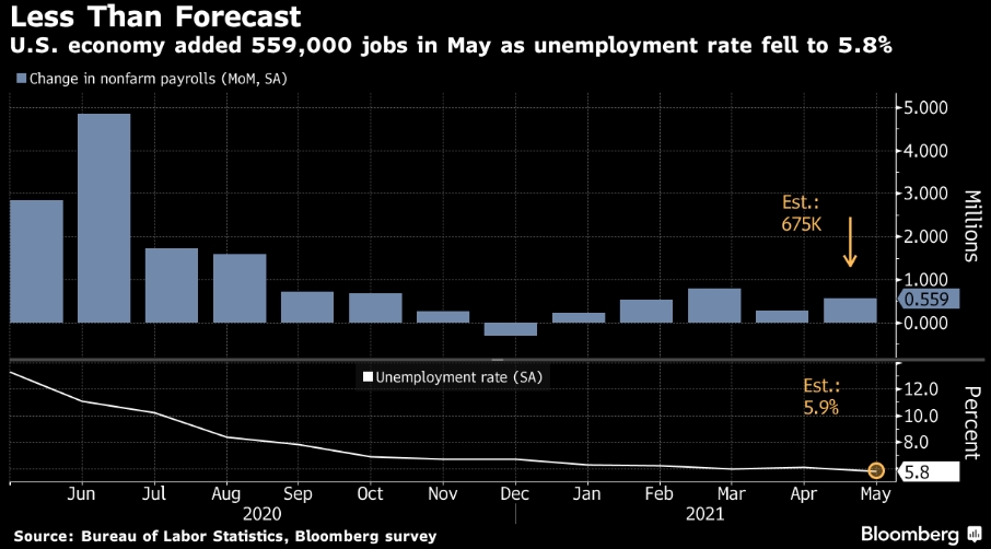 Экономисты, опрошенные Reuters, прогнозировали создание 650 000 рабочих мест в мае. Уровень безработицы упал до 5,8% с 6,1% в апреле. Уровень безработицы был занижен людьми, ошибочно относящими себя к категории «работающих, но отсутствующих на работе».