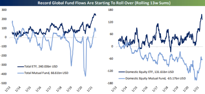 Левый график: совокупная динамика потоков капитала в биржевых (ETF, синим) и взаимных (голубым) фондах. Правый график: динамика потоков капитала в местных биржевых (ETF, синим) и взаимных (голубым) фондах. Все цифры в млрд долларов. Источник: Variant Perception