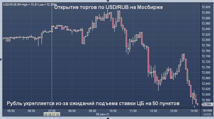Рубль вырос. Доходность облигаций также неожиданно выросла четвертый день подряд после данных об ускорении инфляции до самых высоких темпов с 2016 года, что побудило экономистов повысить свои прогнозы относительно размера возможного повышения ставок на заседании Банка России в пятницу.