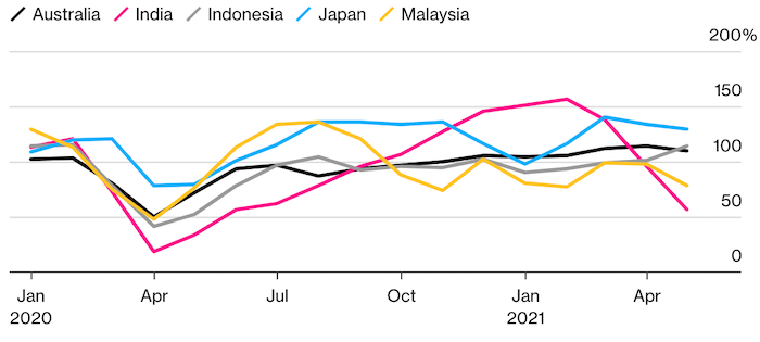 Вторая волна вируса в Индии подорвала потребление топлива и парализовала систему здравоохранения страны. Продажи бензина и дизельного топлива упали в мае по сравнению с предыдущим месяцем, в то время как данные по перемещению населения от Apple Inc. показали, что в январе 2020 года интенсивность трафика в среднем составляла 57% от докоронавирусного уровня. Производственная активность также замедлилась.
