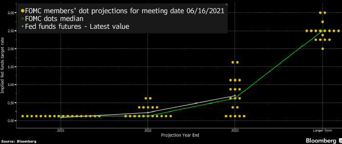 7 из 18 членов FOMC прогнозируют повышение ставок уже в 2022 году (против 4 в марте).