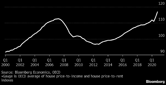«Смесь факторов провоцирует рост цен на жилье к беспрецедентным уровням по всему миру», - говорится в работе Bloomberg Economics. - «Рекордно низкие ставки, беспрецедентное бюджетное стимулирование, сбережения, накопленные во время локдаунов, ограниченное предложение недвижимости и ожидания быстрого восстановления мировой экономики вносят лепту в рост цен».