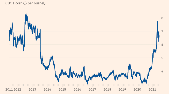 В последние несколько недель цены упали с многолетних максимумов, поскольку доллар укрепился, а на среднем западе США прогнозируются дожди. Тем не менее, фьючерсы на кукурузу подорожали вдвое по сравнению с прошлогодним показателем $3.29 за бушель, соевые бобы выросли на 65% до $14.31, а пшеница почти на треть — до $6.54.