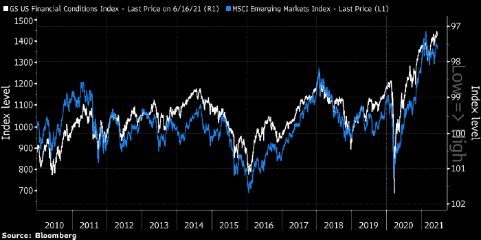 Спрос на рискованные активы, включая валюты и акции EM, сильно коррелирует с динамикой финансовых условий в США. Мысли о тейперинге, которые завладели умами инвесторов в середине недели, пока не привели к ухудшению этого показателя. Индекс финансовых условий Goldman Sachs U.S. Financial Conditions index указывает на то, что они все еще остаются в области наиболее благоприятных уровней за всю историю.