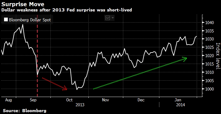 После заседания в сентябре 2013 г., которое - вопреки ожиданиям - не завершилось решением о сокращении QE, индекс доллара США Bloomberg упал примерно на 3% за двухмесячный период.