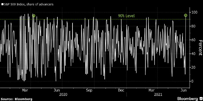 Процент компонентов S&P 500, закрывших день ростом. Источник: Bloomberg