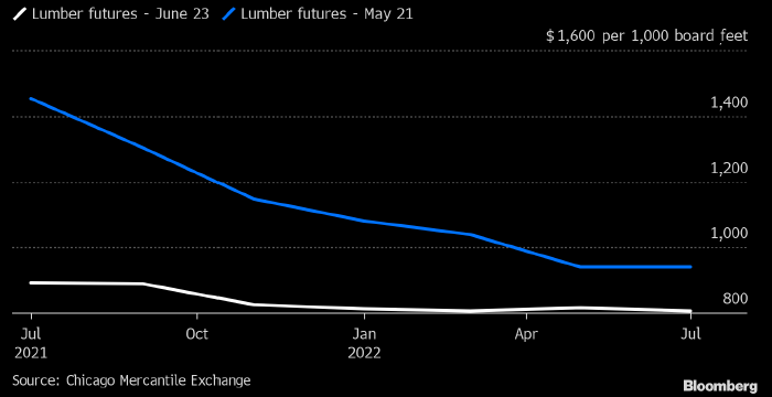 Кривая фьючерсов на древесину на CME по состоянию на 23 июня (белым) и 21 мая (голубым). Источник: Bloomberg