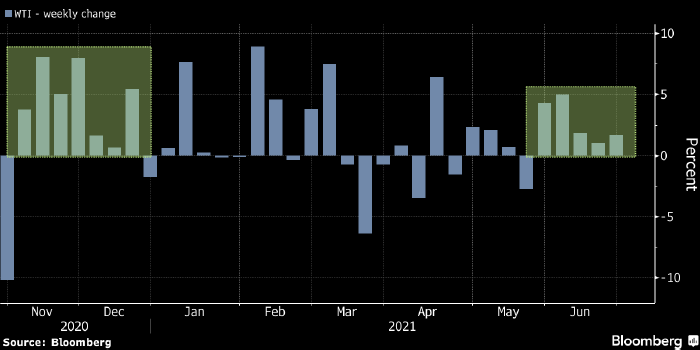В понедельник цена нефти WTI впервые за почти три года поднялась выше $73 за баррель. Теперь она готовится закрыть ростом пятую неделю подряд, что является наиболее продолжительным периодом роста с декабря.