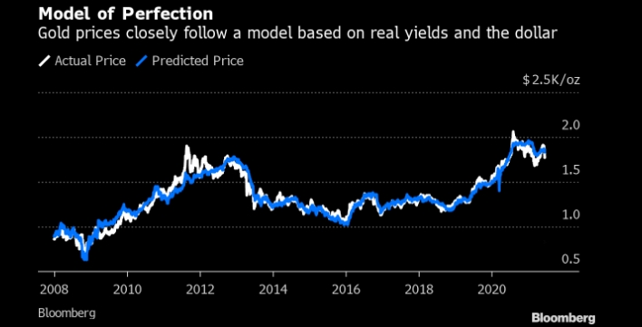 Регрессионный анализ с использованием долларовой 10-летней доходности казначейских облигаций с поправкой на инфляцию имеет завидный рекорд в моделировании цен на золото. Измеряемый на момент закрытия торгов с января 2008 года, он дает R-квадрат 0,94 - почти идеальную корреляцию (см. график ниже).