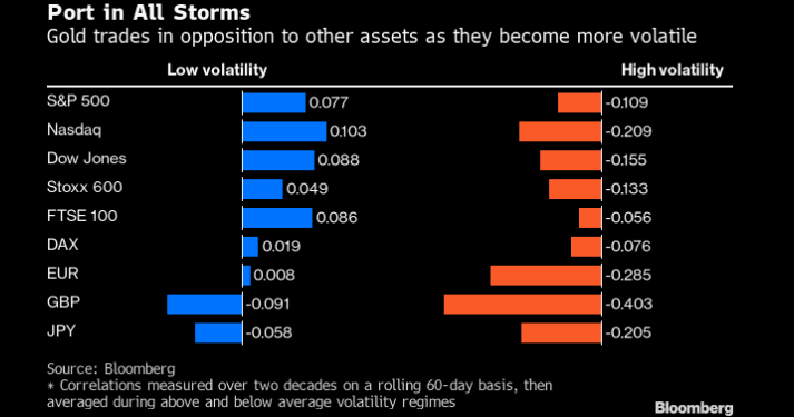 Золото лучше всего подходит для защиты от широкого спектра рисков. Для основных фондовых индексов и наиболее ликвидных валют обратная корреляция между золотом и встречным активом становится сильнее по мере увеличения волатильности другого актива. В приведенной ниже таблице показана средняя корреляция с золотом при изменении видов волатильности. Данные за последние два десятилетия были собраны Bloomberg за 60 дней. Для валют взаимная корреляция была измерена с ценой на золото в этой валюте на конец 2020 года (см. график ниже).